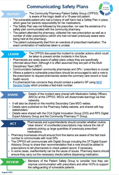 The Community Pharmacy Patient Safety Group is aware of a tragic death of a young patient. The vulnerable patient had a Safety Plan in place, which gave her parents responsibility for her medications.