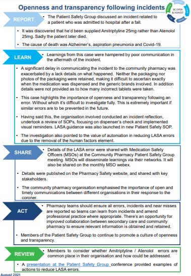 The Community Pharmacy Patient Safety Group discussed an incident in which learnings from this case were hampered by poor communication in the aftermath of the incident.